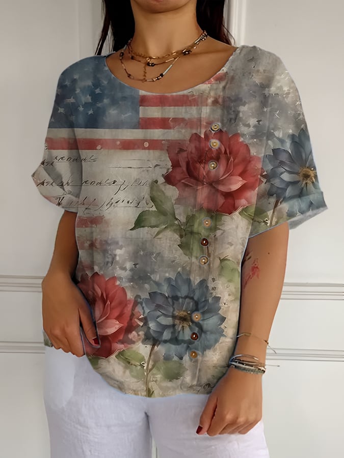 Women's Independence Day Short Sleeve Cotton and Linen Shirt