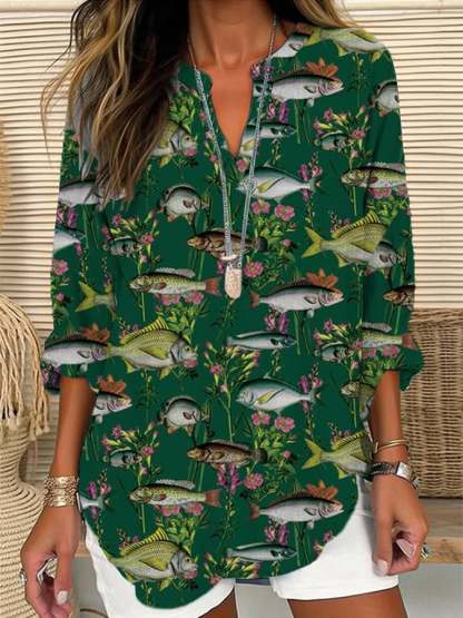 Women's Retro Forest Print Casual Long Sleeve V-Neck Shirt