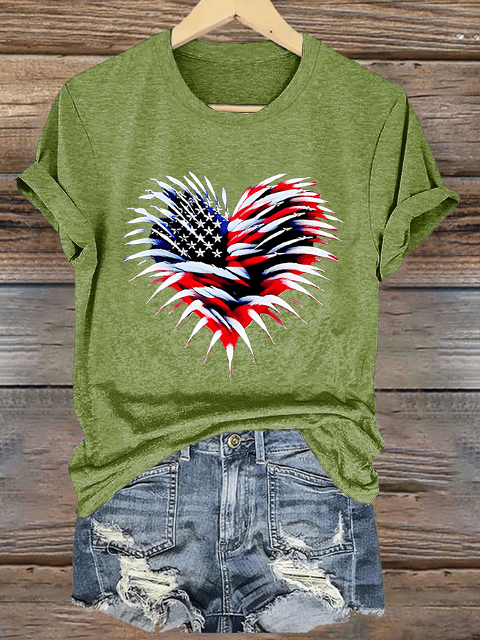 Womens Retro Independence Day Flag Heart Fireworks Print T-Shirt