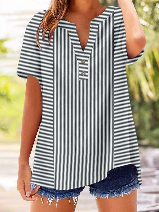 Women's Retro Striped Button Design V-Neck Short Sleeve Shirt