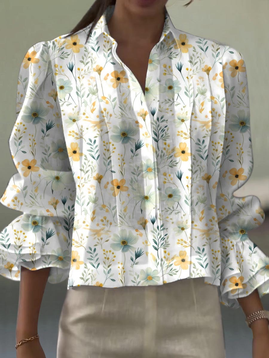Women's Vintage Floral Art Print Casual Long Sleeve Cotton And Linen Shirt