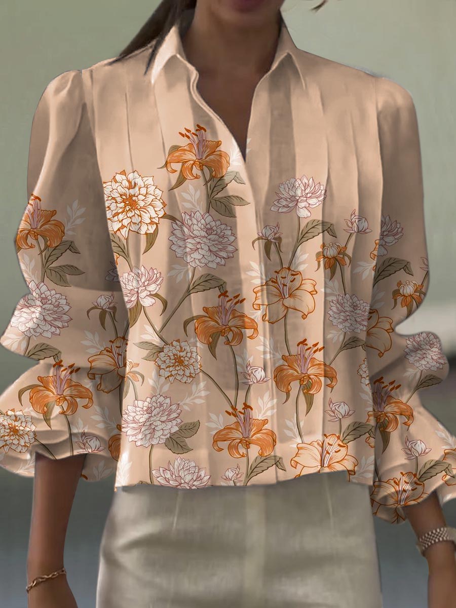 Women's Vintage Floral Art Print Casual Long Sleeve Cotton And Linen Shirt