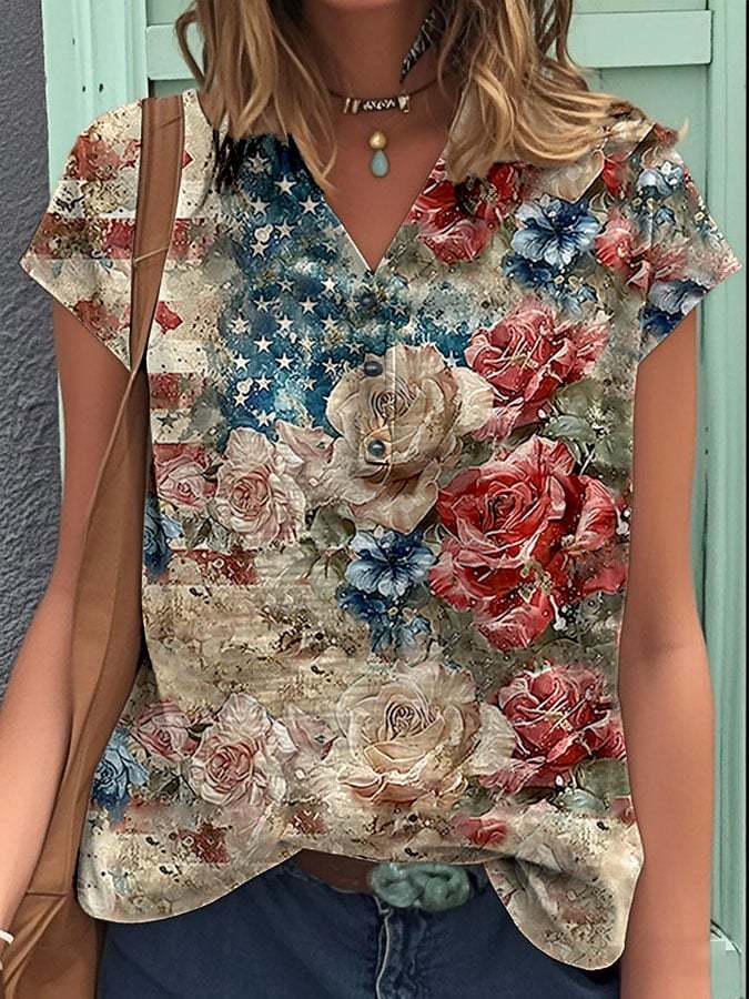 Women's Vintage Independence Day Flag Floral Print Button-Down Shirt