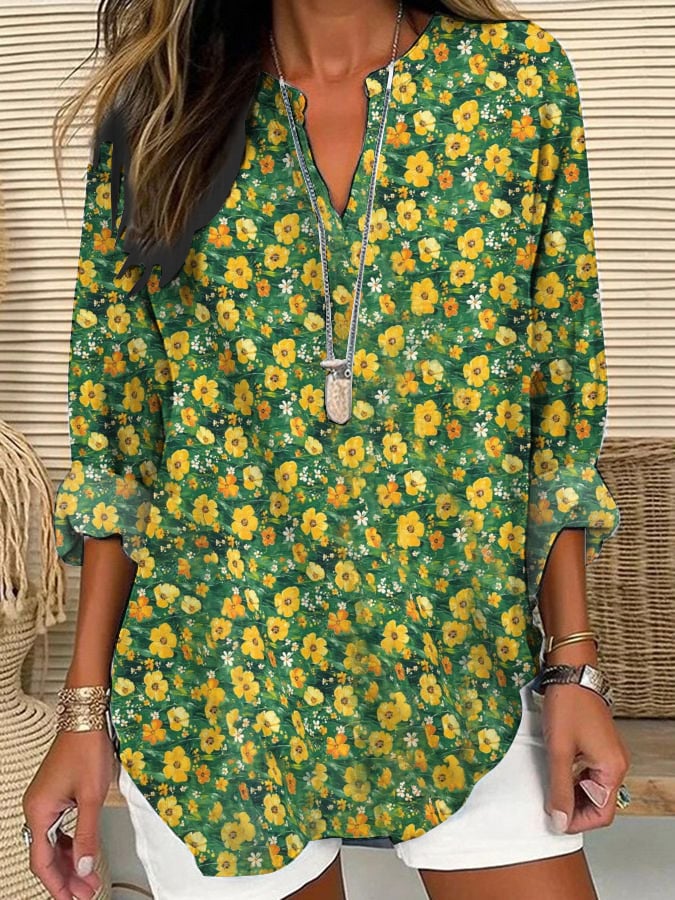 Women's Watercolor Plant Art Print Casual Long Sleeve V-Neck Shirt