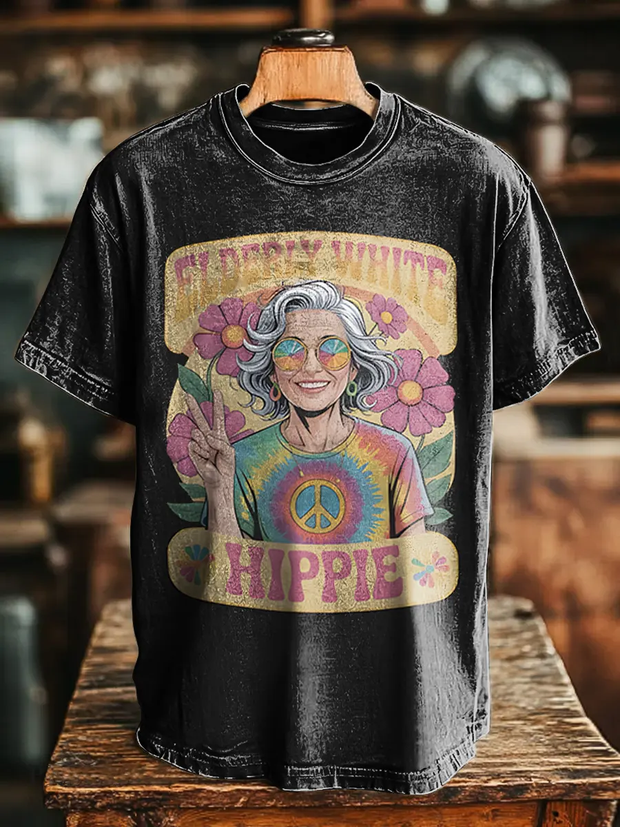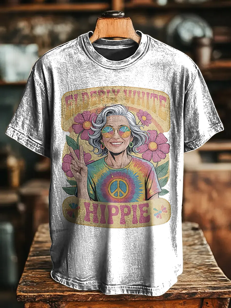 Eldely White Hippie Flowers Unisex Vintage Art Print Casual T-shirt