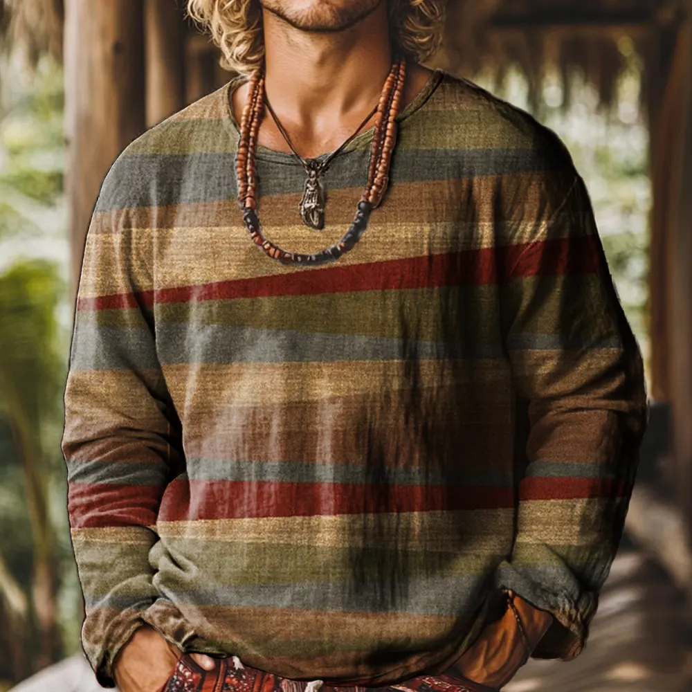Retro National pattern stripes Pattern Vintage Print Casual Cotton Shirt