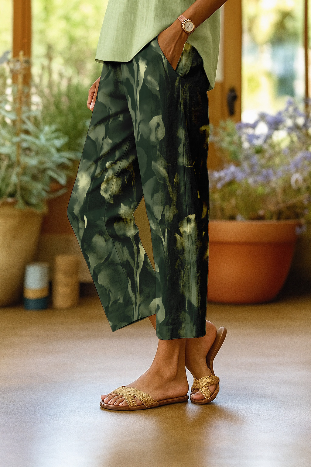 Women's Casual Tulip Print Cotton And Linen Trousers (with Pockets)