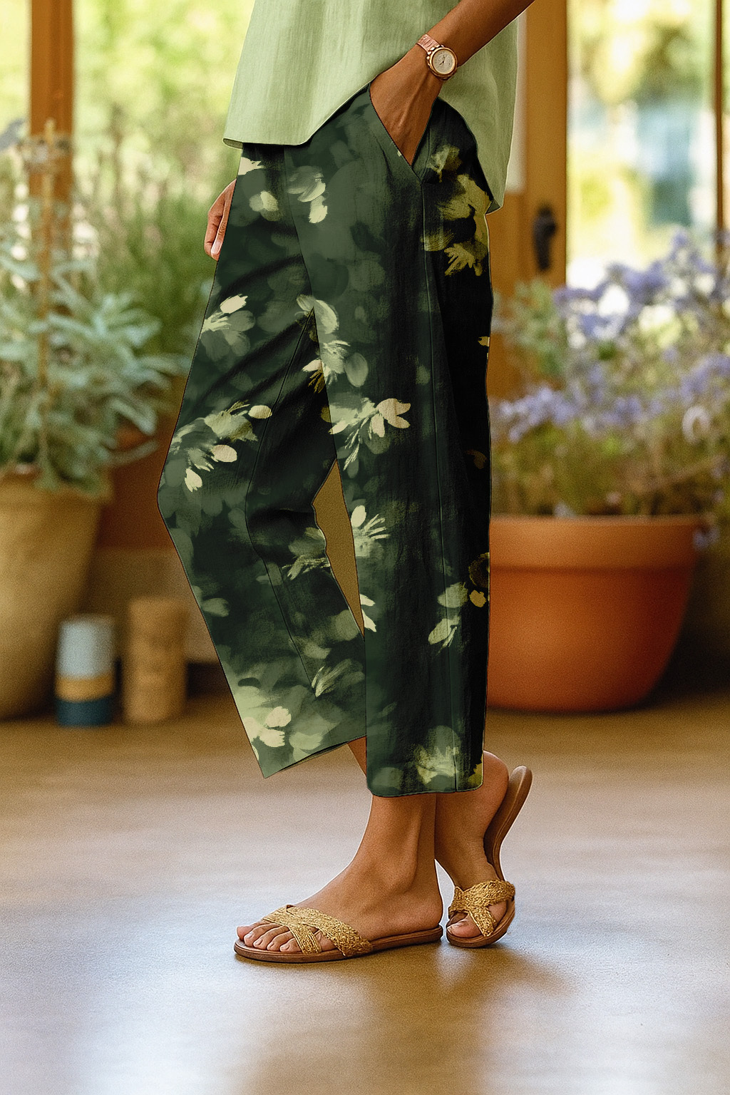 Women's Casual Watercolor Print Cotton And Linen Trousers (with Pocket)