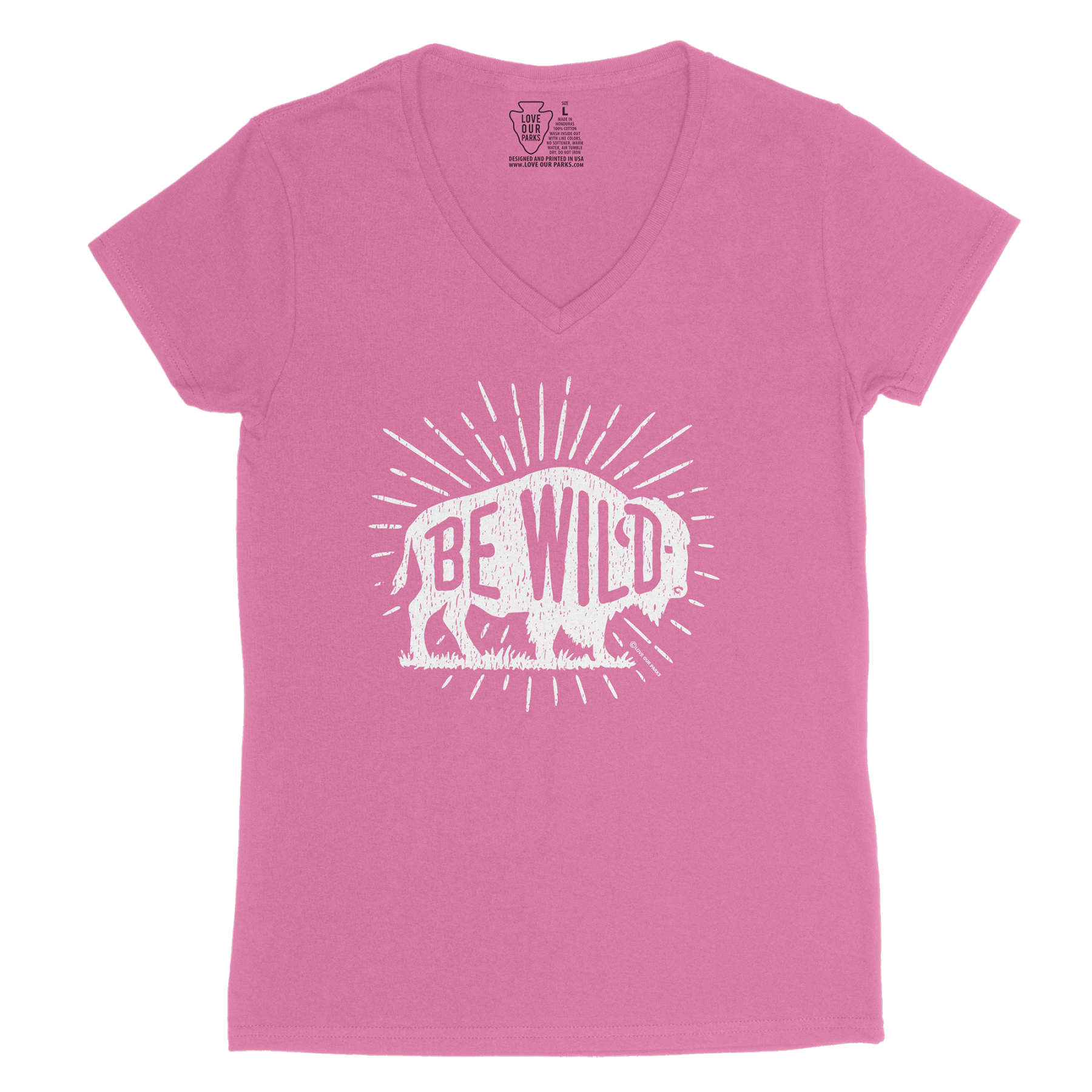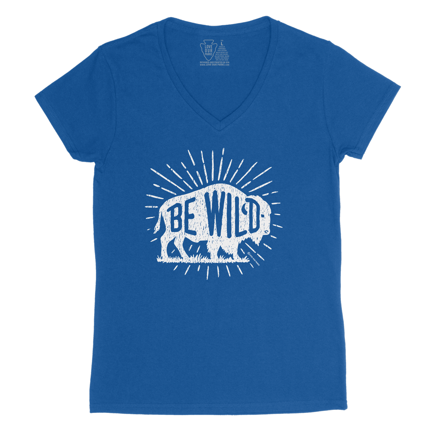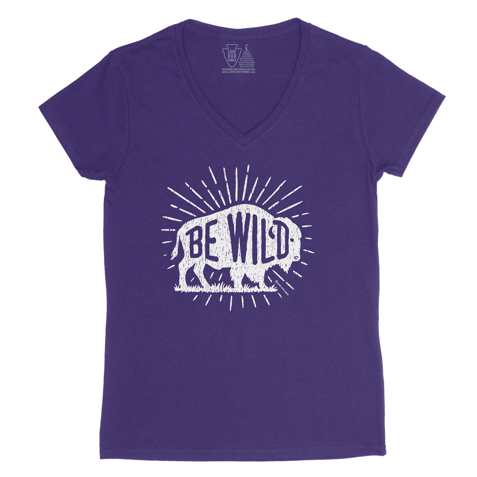 Pay tribute to the king of the prairie with our Be Wild Bison women's v-neck tee. Bold “BE WILD” lettering runs through a classic bison silhouette with hand-drawn distressing and sunburst rays—an ode to wide-open grasslands and big-sky freedom. Perfect for park days, road trips, and anyone who carries a little frontier spirit wherever they roam.