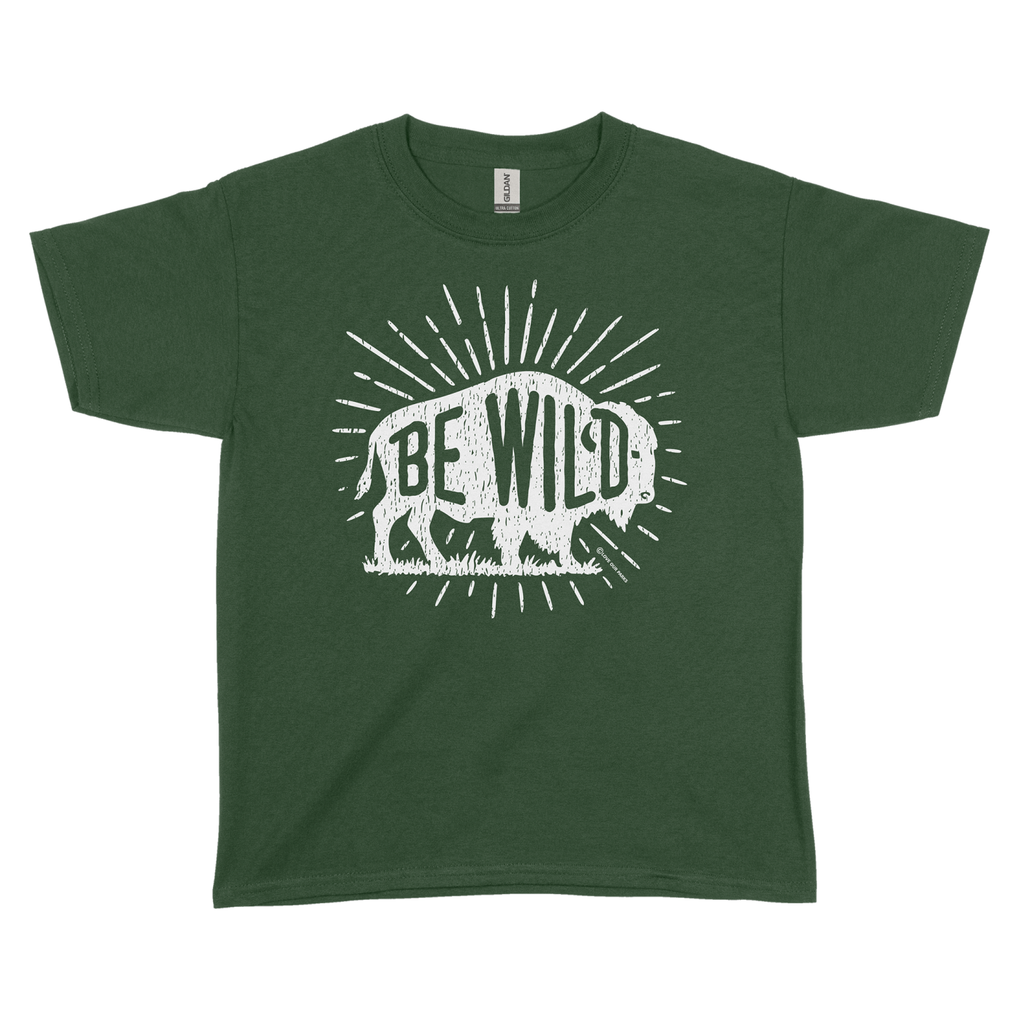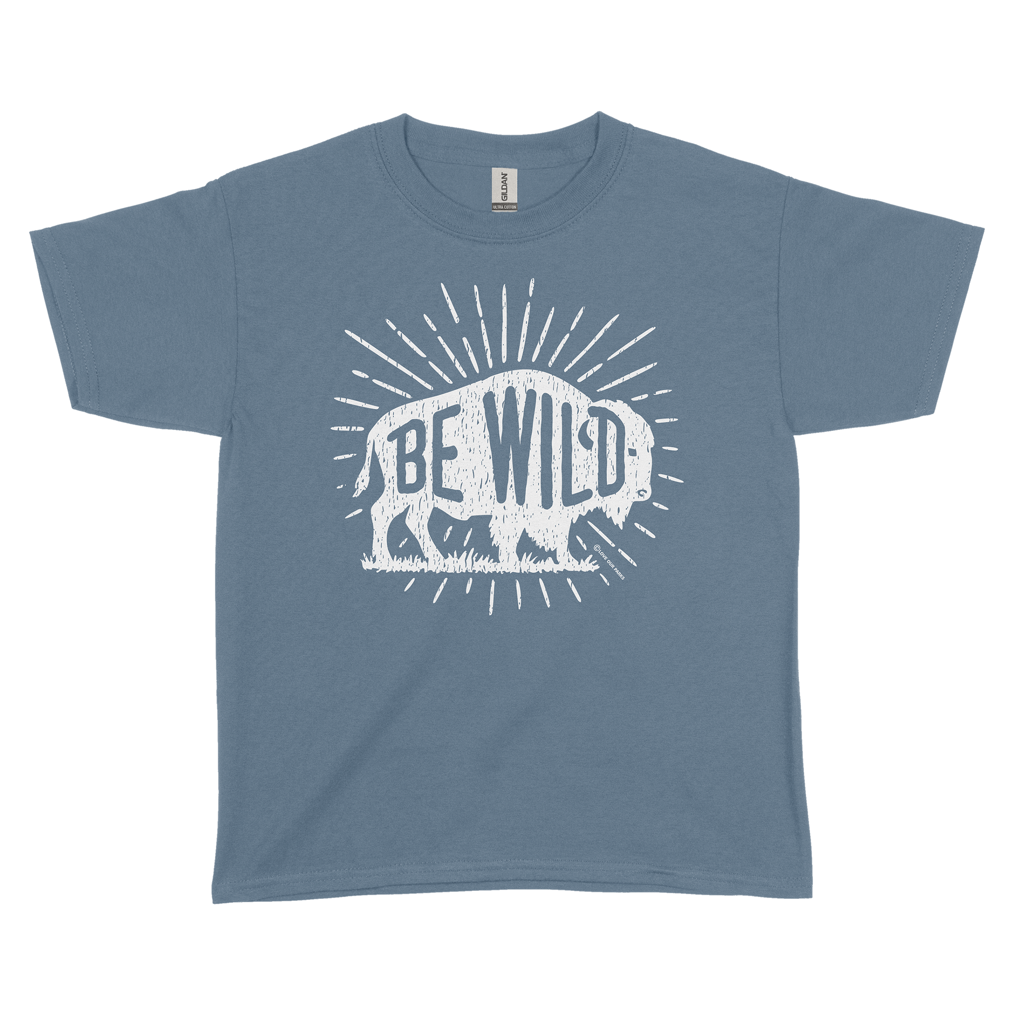 Celebrate the king of the prairie with our Be Wild Bison youth tee. Bold “BE WILD” lettering runs through a classic bison silhouette with hand-drawn distressing and sunburst rays—an ode to wide-open grasslands and big-sky freedom. Perfect for your junior ranger's next adventure.