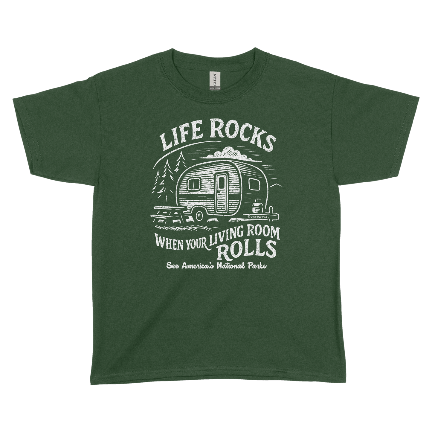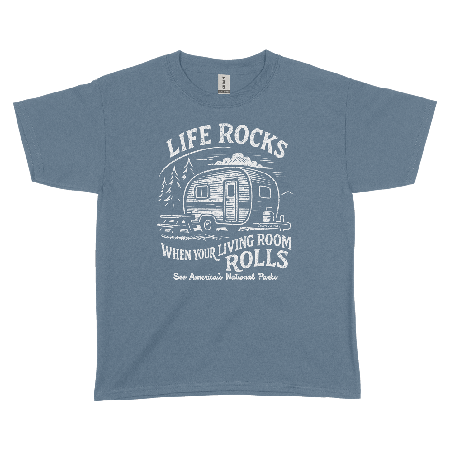 For those who feel most at home on the road, this youth tee is made for you. Featuring a vintage camper design and the phrase “Life Rocks When Your Living Room Rolls,” it captures the freedom of life on wheels and the beauty of waking up somewhere new. Made from mid-weight, durable cotton and available in three different colors, it’s perfect for road trips, campsite hangs, and everyday wear. Designed and printed in the USA, each tee supports the parks that make our adventures possible.