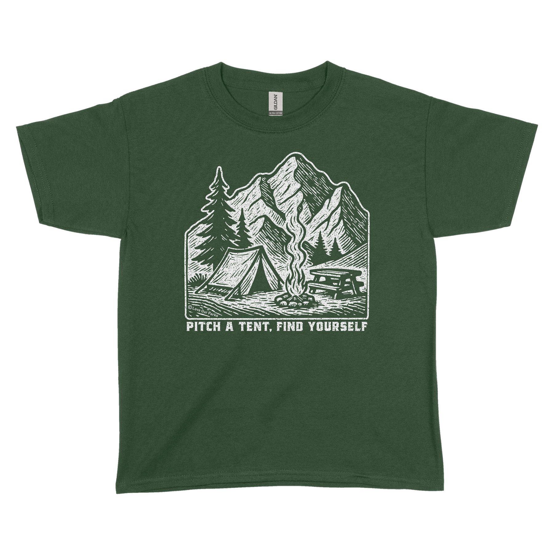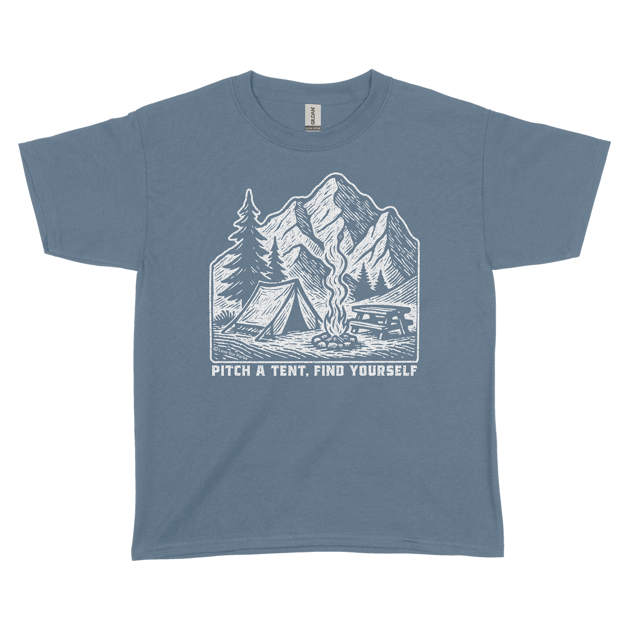 Reconnect with the wild on your terms with our Pitch A Tent, Find Yourself Youth Tee. Featuring the scene of a tent pitched beside a crackling campfire beneath alpine peaks, this design captures the quiet, grounding power of a night in nature. With the phrase “Pitch A Tent, Find Yourself,” it’s a reminder that sometimes, all it takes to rediscover who you are is a little time under the stars.