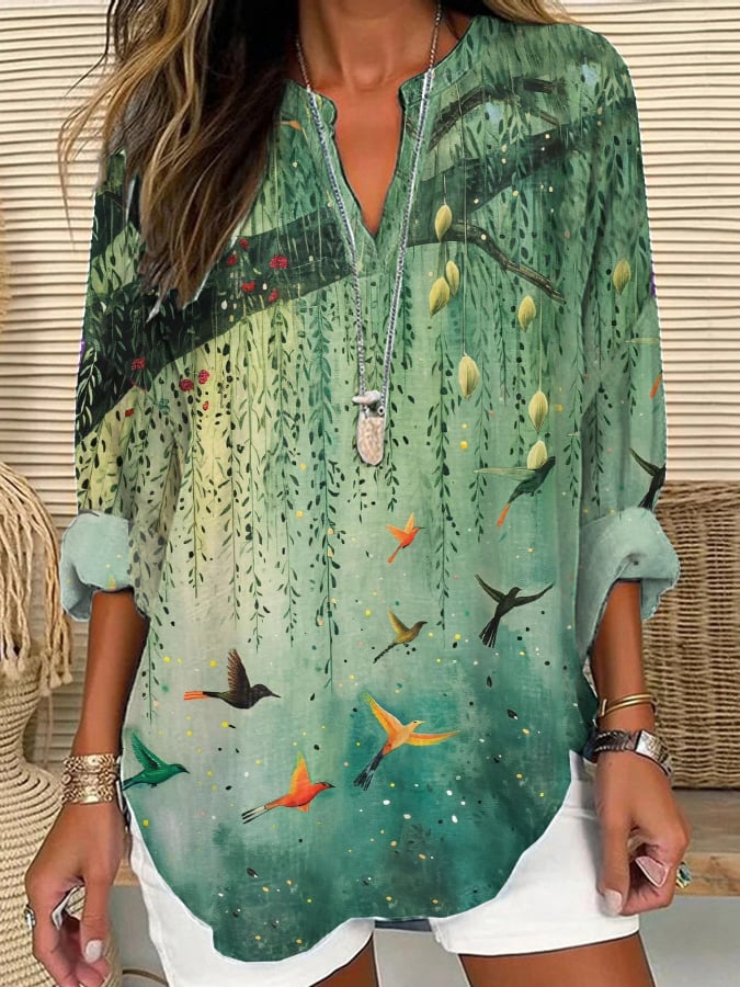 Women's Casual Forest Bird Art Print Shirt