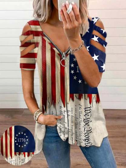 🔥Last Day 49% Off🔥Women's Independence Day Printed V-neck Zipper Casual T-shirt